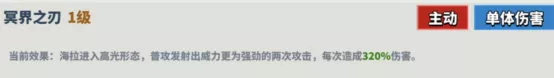 描述:海拉进入高光形态,普攻发射出威力更为强劲的两次攻击,每次造成320%伤害。