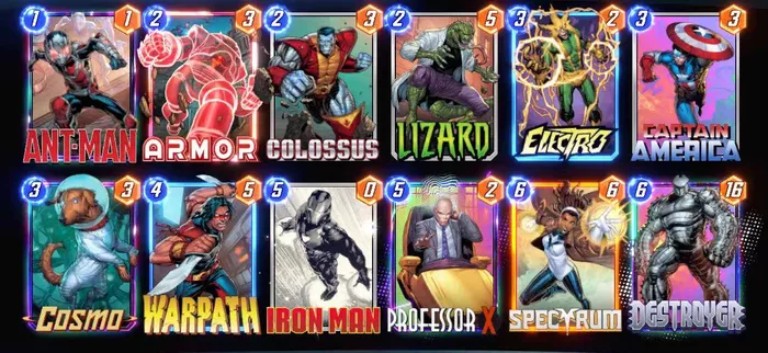 # (1) Ant Man# (2) Armor# (2) Colossus# (2) Lizard# (3) Electro# (3) Captain America# (3) Cosmo# (4) Warpath# (5) Iron Man# (5) Professor X# (6) Spectrum# (6) Destroyer#QW50TW42LEFybXI1LENsc3NzOCxMenJkNixFbGN0cjcsQ3B0bkFtcmNFLENzbTUsV3JwdGg3LElybk1uNyxQcmZzc3JYQSxTcGN0cm04LERzdHJyOQ==## 要使用此卡组,复制它到你的剪切板后,在MARVEL SNAP中打开卡组编辑界面进行粘贴。