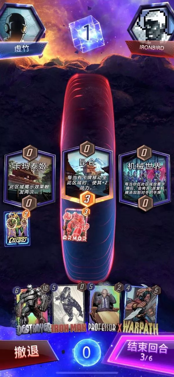 T1打蚁人T2铠>钢力士=蜥蜴,手里有狗可行优先打蜥蜴T3电王>科斯莫>美国队长,这回合出什么牌较为要点,还得基于现场实际情况进行抉择,手里有多张高费用牌时打电王。2回合打了蜥蜴,3回合先手可行打狗,美队是备选。T4打真途,若3回合打了电王,这回合可行x教授锁或者打钢铁侠。T5钢铁侠或者x教授,若之前打过电王可行打光谱,结尾用毁灭者终结。T6一般已毁灭者结束,单赢下一路。结尾给大家看一个实战演示:第一回合空过了第二回合在中路打了铠,因为考虑到可行在一路打电王或者科斯莫。
