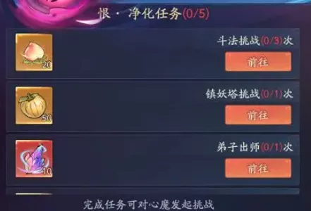 2、我们须要完成五个恨·净化任务即可向心魔发起挑战: