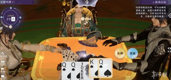 1、玩法:每回合玩家将轮流行动。到自己的回合时,你可以挑选[出牌]或者[质疑]上家。