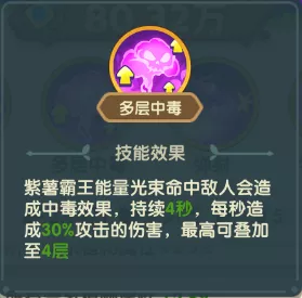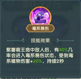 攻击速度:0.5 射程:6格 被动技能: 紫薯霸王在场后,场上所有毒系植物攻击 22%,最多叠4层