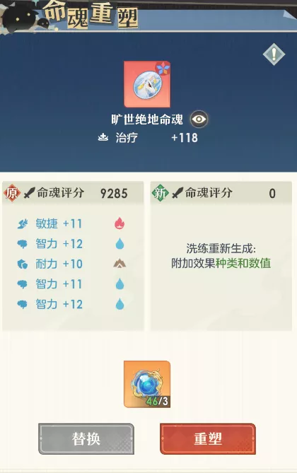 命魂的基础属性不能更改,但附加效果(属性类型/数值、五行类型)可通过【重塑】更改。这个方式是刷出须要的五行谐和效果的最重要途径。