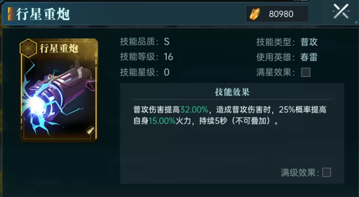 4、行星重炮:提升普攻伤害,造成普攻伤害时概率提升火力,持续5秒时间。