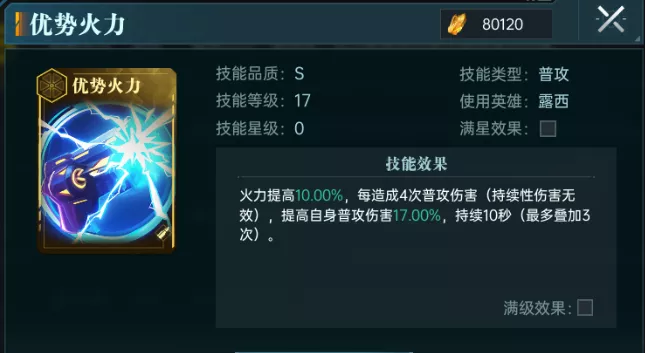 5、优势火力:火力提升,每造成4次普攻伤害提升自身普攻伤害,持续10秒时间(最多叠加3次)。