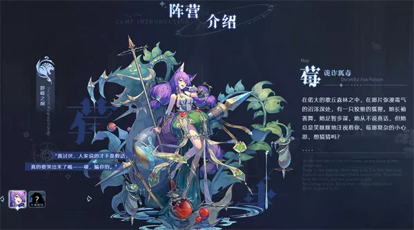 在偌大的歌丘森林之中,在那片弥漫毒气的沼泽深处,有一只狡猾的狐狸。她长袖善舞,她足智多谋,她从不说真话,但她总是笑眯眯地注视着你。莓那复杂的小心思,想猜猜吗?