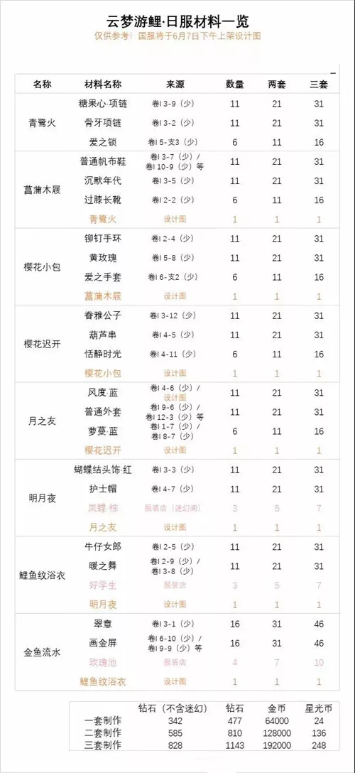 奇迹暖暖云梦游鲤套装材料消耗一览
