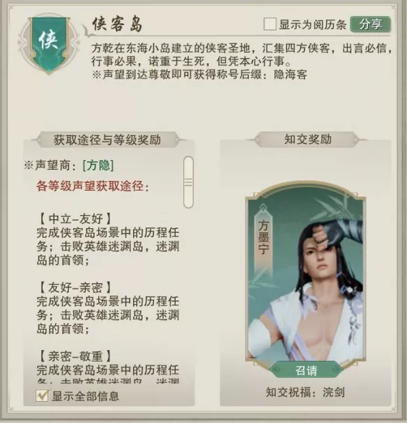 2、声望到了【尊敬】后完成侠客岛历程任务,战胜英雄迷渊岛首领才能提高;