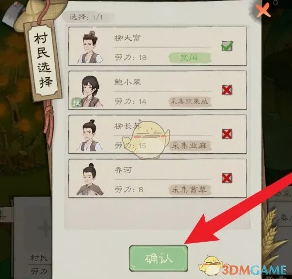 3、而后在农民选取页面,找到空闲的农民点击确认;