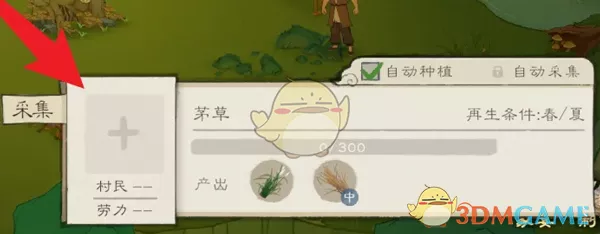 2、挑中茅草后,点击左侧的加号添加农民进行采集;