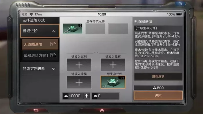 我们先利用二级生存元件进行进阶,可以看到新增的四个进阶属性。
