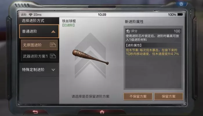 首先准备一个便宜点的近战武器(推荐价格便宜的铁丝球棍~),接着放入生存元件进行进阶。