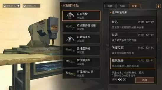 幸存者们可以把它装备到副武器上,将会增加采集资源的属性,一件简轻松单的采集副武器就这么诞生了~
