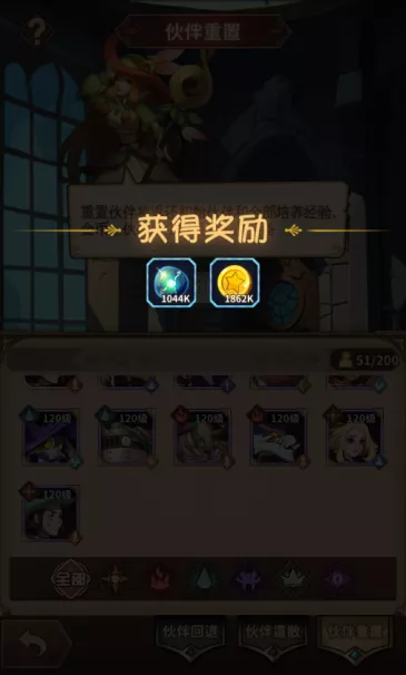2、重置完成后,伙伴重置为初始等级,并且这些伙伴身上得装备,培养他们消耗得金币,经验和伙伴粉尘将会返回到背包中;