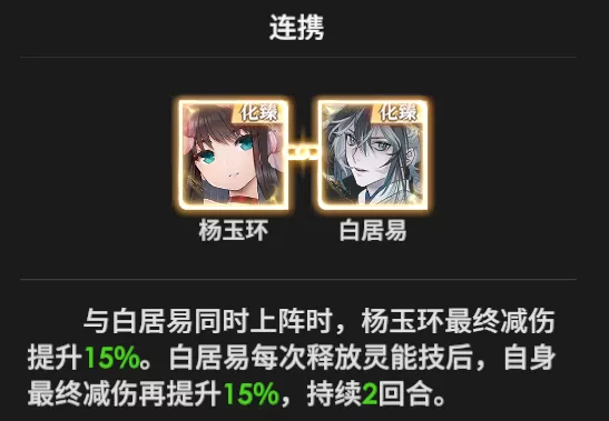 与白居易同时上阵时,杨玉环结尾减伤增强15%。白居易每次释放灵能技后,自身结尾减伤再增强15%,持续2回合。