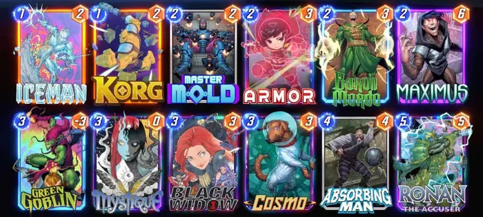 # (1) Iceman# (1) Korg# (2) Master Mold# (2) Armor# (2) Baron Mordo# (2) Maximus# (3) Green Goblin# (3) Mystique# (3) Black Widow# (3) Cosmo# (4) Absorbing Man# (5) Ronan the Accuser#QnJuTXJkQSxNc3RyTWxkQSxCbGNrV2R3QSxBYnNyYm5nTW5DLFJubjUsQXJtcjUsSWNtbjYsS3JnNCxNeG1zNyxHcm5HYmxuQixDc201LE1zdHE4##