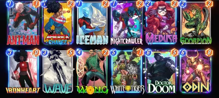 # (1) Ant Man# (1) America Chavez# (1) Iceman# (1) Nightcrawler# (2) Medusa# (2) Scorpion# (3) Ironheart# (3) Wave# (4) Wong# (5) White Tiger# (6) Doctor Doom# (6) Odin#QW50TW42LEFtcmNDaHZ6RCxJY21uNixOZ2h0Y3J3bHJDLE1kczYsU2NycG44LElybmhydDksV2h0VGdyQSxPZG40LERyRG02LFd2NCxXbmc0##