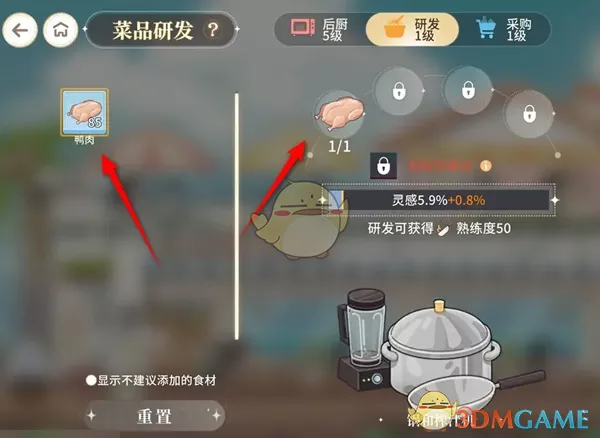 3、在菜品研发页面,消耗鸭肉,点击开始研发;