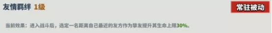 描述:进入战斗后,选定一名距离自己最近的友方作为挚友提高其生命上限30%。