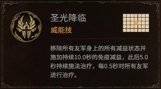 阿西莉亚的战技【白金光辉】和威能技【圣光降临】都能给队员们们带来可观的治疗效果,大剑举起,移除所有友方目标身上的所有减益状态并施加免疫减益;
