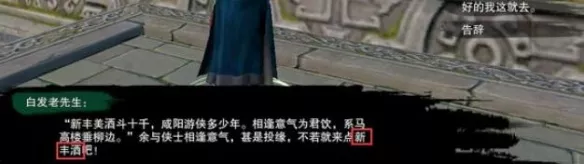 3、在【酒商】处购买【新丰酒】给【白发老先生】;
