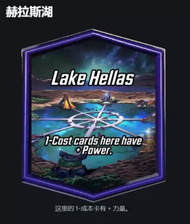 区域卡:代表不相同的漫威场景,每个区域卡可以提高或减弱英雄卡的能力,或者提供某些特殊效果。如下图赫拉斯湖这个区域,能量消耗为1的卡牌可以额外增加2点战力,那么玩家就该在对战的时候尽量把1费卡打在该区域以获得更高的综合战力。