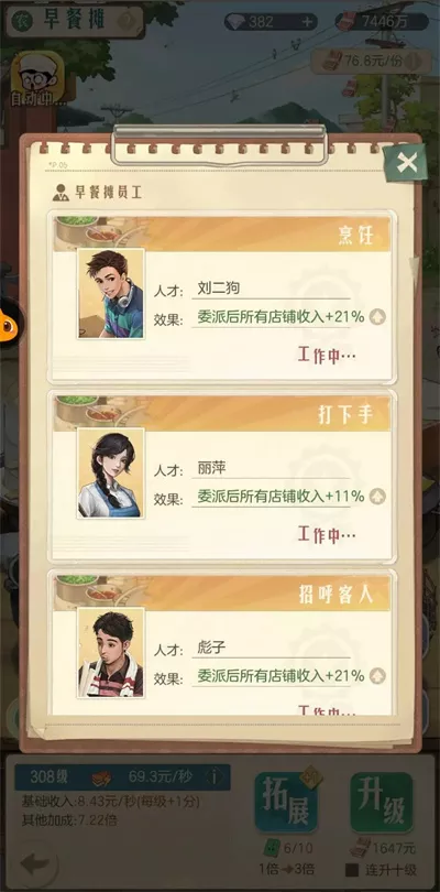 2、优先让主培养的人才放置的商铺多升级和拓展,快速提高我们的总收入。
