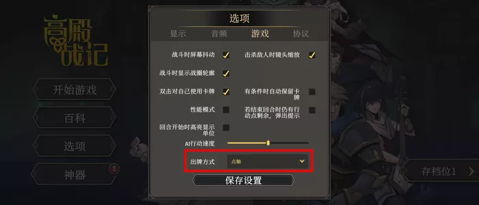 进去游戏后默认为【点触】出牌方式,若要调整为【拖动】模式,允许在【选项】中的【游戏】设置里找到【出牌方式】进行切换并【保存设置】。