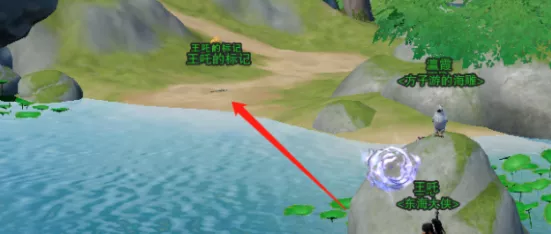 4、飞到左上方的岸边,找到王吒的标记,跟随脚印找到蓬蓬。建议骑马去找,找到后下马去点击它。