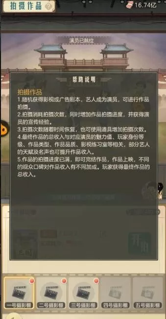 1、拍摄作品时须要消耗胶卷且须要主演参与拍摄,参与拍摄的艺人魅力值越高拍摄出的作品收益则越高,通过送礼允许提高艺人的魅力值。