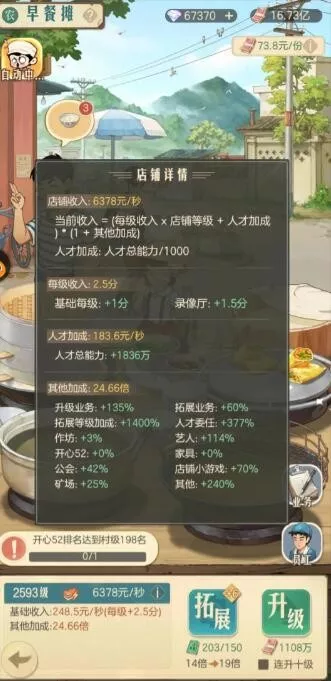 1、以早餐摊为例:店铺升级收入 =(基础每级 店铺等级)/秒;
