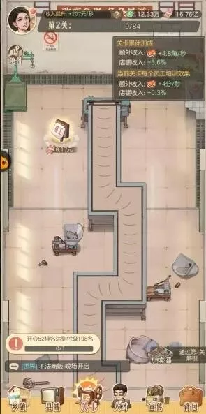 1、通过培训员工进行作坊运转进行关卡的推进,推进的关卡越多拿到的收入越多。