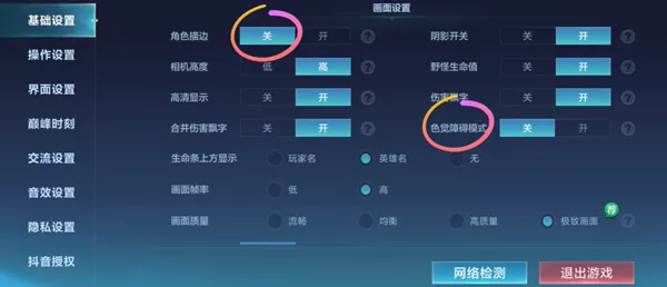 6、在基础设置中,除了关闭角色描边和色觉障碍模式之外,其他的全部开启。