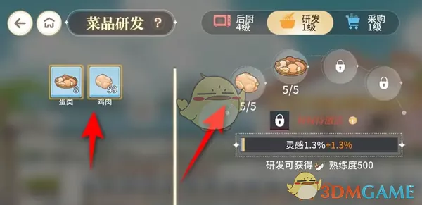 3、随即在菜品研页面,消耗鸡肉和蛋类进行研发;