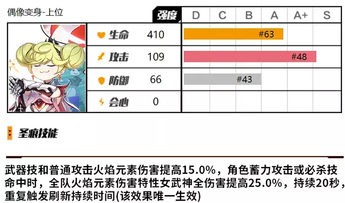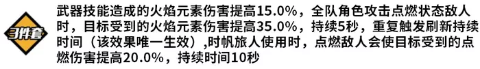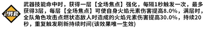 提高了普攻和武器技造成的火伤,并且释放蓄力或必杀后能使队伍中火伤角色的全伤提高。触发加成的条件并不苛刻,持续时长也大体能够覆盖流程,但是限定火伤角色在一定程度上限制了通用性。启动后数值尚可,不过还是更适合辅助角色携带。