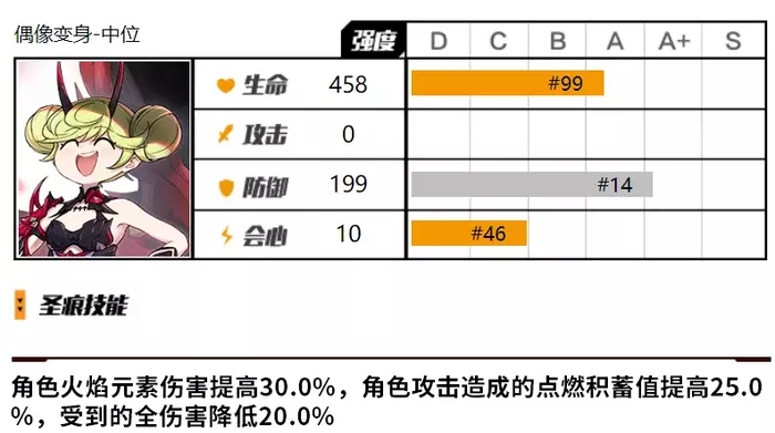 中位提供了无条件火伤加成以及点燃积蓄值提高的效果,拥有一定的功能性,在应对部分需要施加点燃异常的敌人时会有不错的效果。