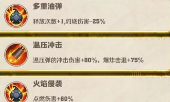 4、在技能加强上选点燃。来烧伤伤害可不要选择它免疫去烧,点燃它并免疫,继续有输出,随即再选其它技能(比如说燃油弹和风。随即空投轰炸4连发加无人机的眩晕,枪械四连发加双发,这一套过的几率也挺大)