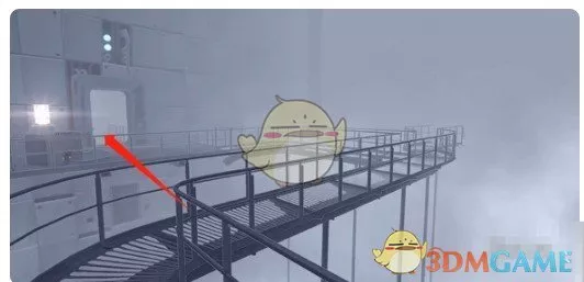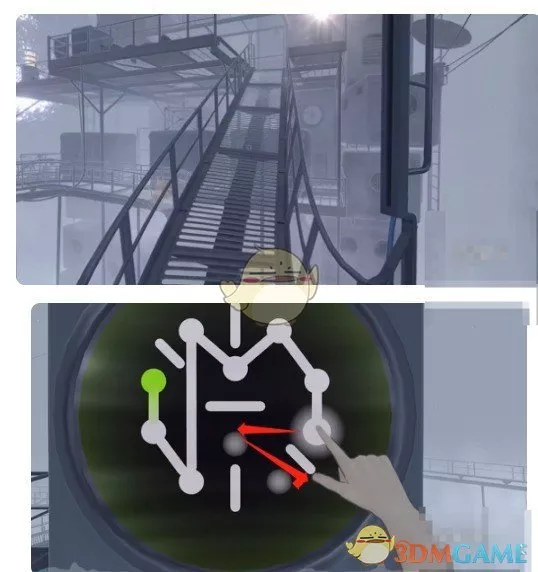2、爬上楼梯后,打开房间,在桥上找到一个机关,完成一笔画小游戏。