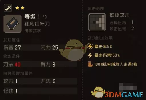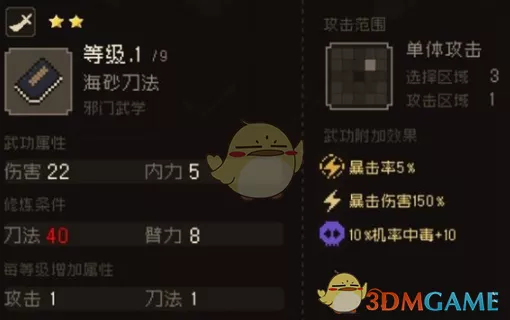 1、海砂刀法:在左下角山洞三斗坪水道1里的江湖郎中处购买获取。