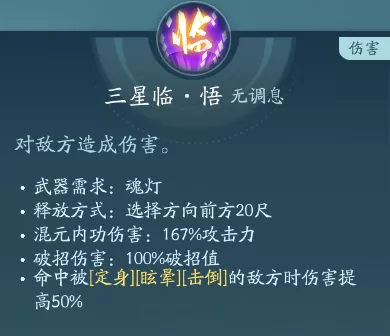 三星临为固定时间跳伤害的条状群攻技能。秘籍PVP点绝篇,PVE点秘章。