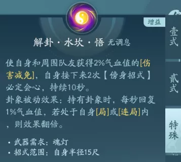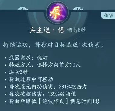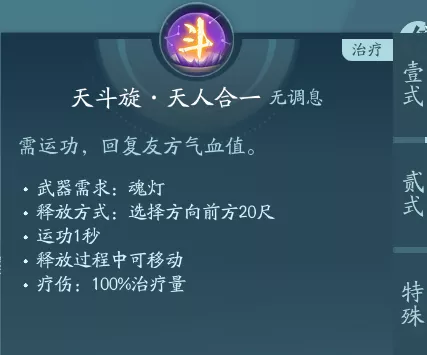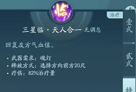 纯PVP技能,PVE刷老本的时候可以带上奶自己两口,在天人合一下释放三星临/天斗旋和兵主逆可以给友方回血。PVP点秘章回血,PVE点绝篇增伤。