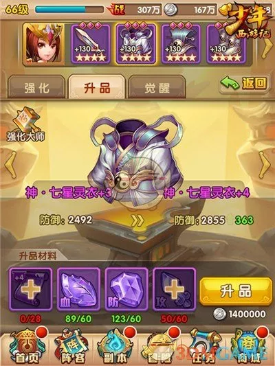“升品”可行大幅度提升装备属性,但须要消耗对应的升品材料(图纸和宝石)。