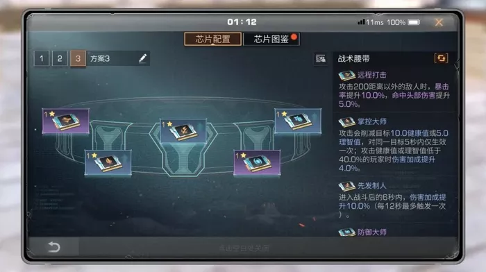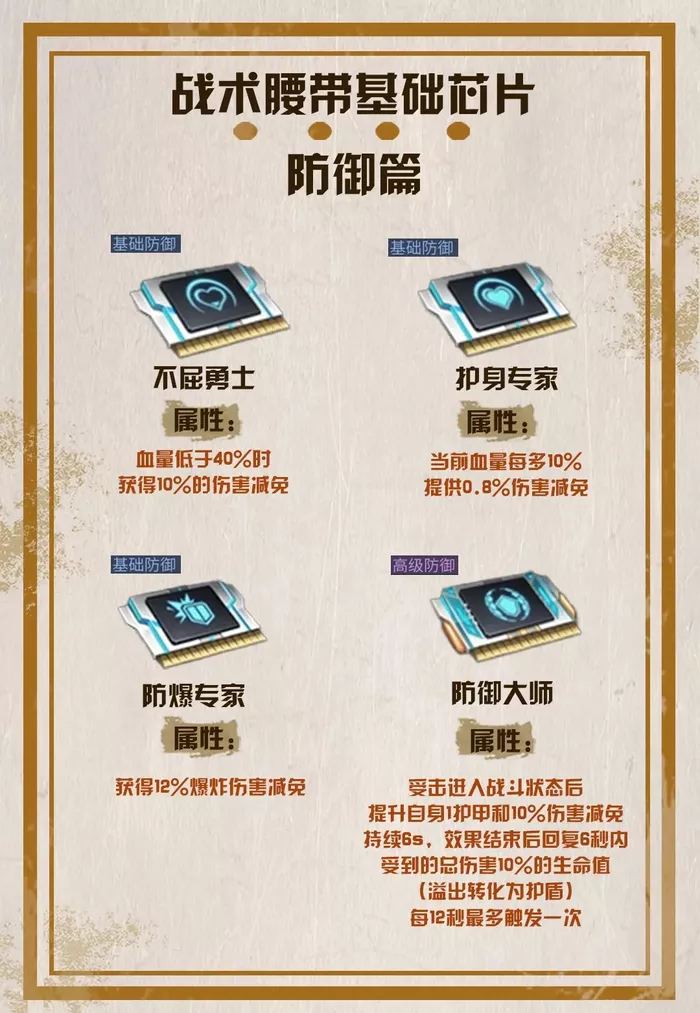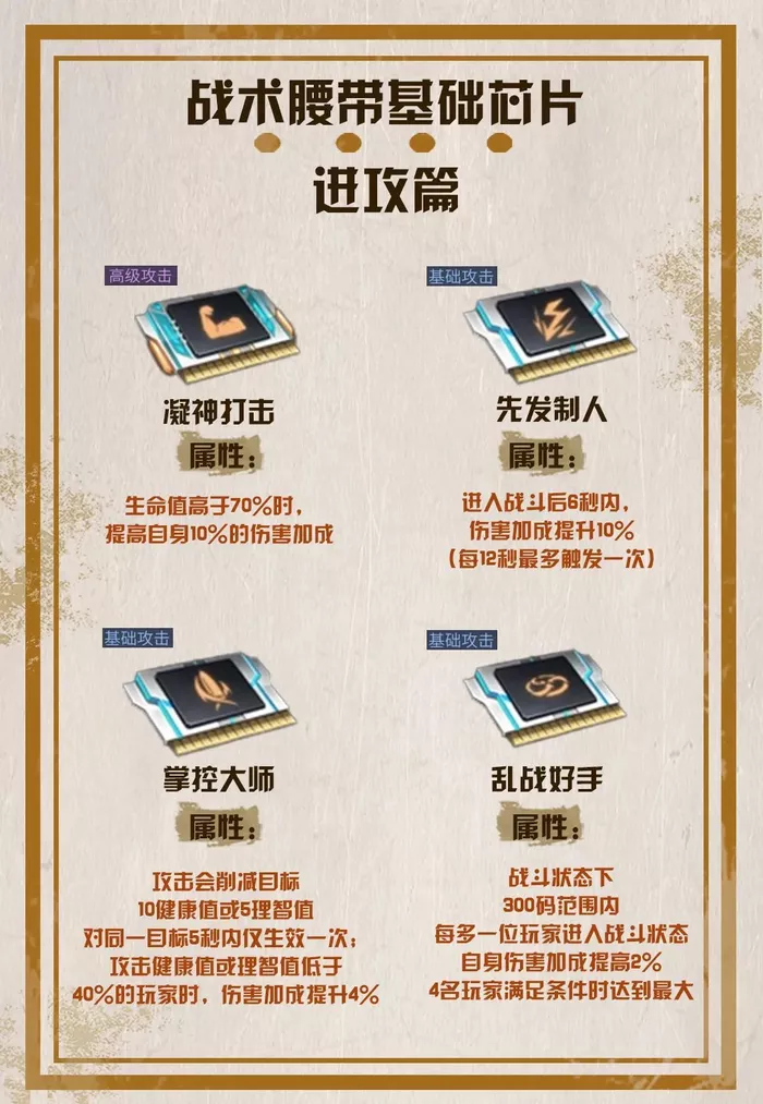 在腰带插槽插入芯片后允许激活芯片对应的特技从而面对不同的战斗环境并且允许切换对应的搭配方案 Tips插槽内芯片允许随时替换插槽数量随战斗等级解锁最多为5个 芯片介绍 芯片分为基础、高级、特级三个品级战术腰带激活后会解锁基础的8枚芯片(进攻型4枚 防御型4枚)