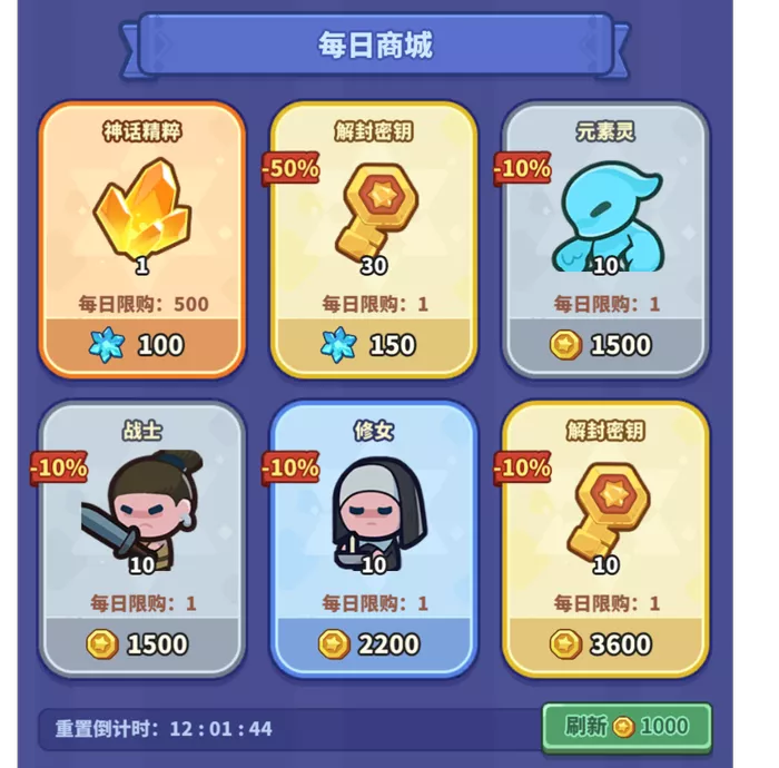 2,游戏主界面左下角的“商城”内,“每日商城”位置,每天会随机刷新。其中的用金币购买的道具,游戏初期每天尽量买光,提高英雄等级来提高总暴击。有白色到金色的英雄碎片、金钥匙、冰镐等等。