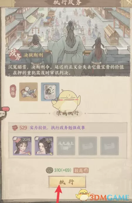 2、打开执行政务页面,在下方点击执行图标,即可前往执行决狱断刑任务,选取合适的僚属。