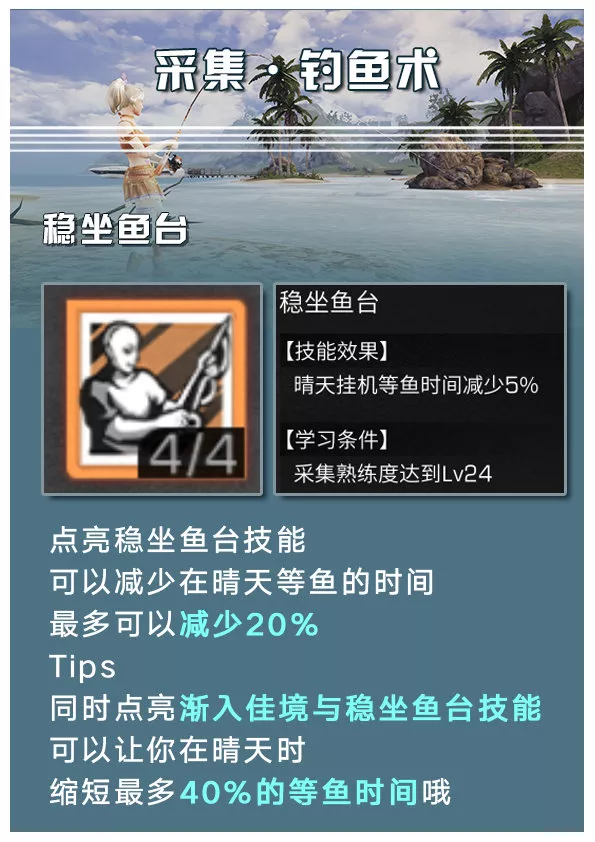 Tips:同时点亮渐入佳境于稳坐鱼台技能能够让你在晴天时缩短最多40%的等鱼时间哦
