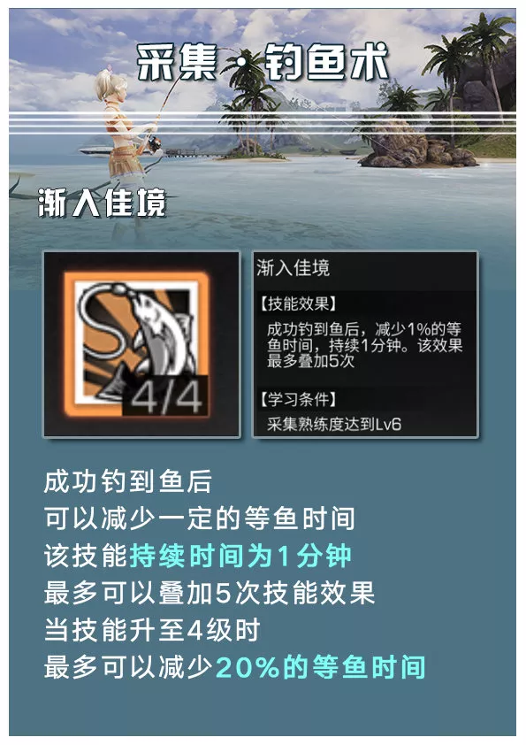 最多能够叠加5次技能效果,当技能升到4级时,最多能够减少20%的等鱼时间。