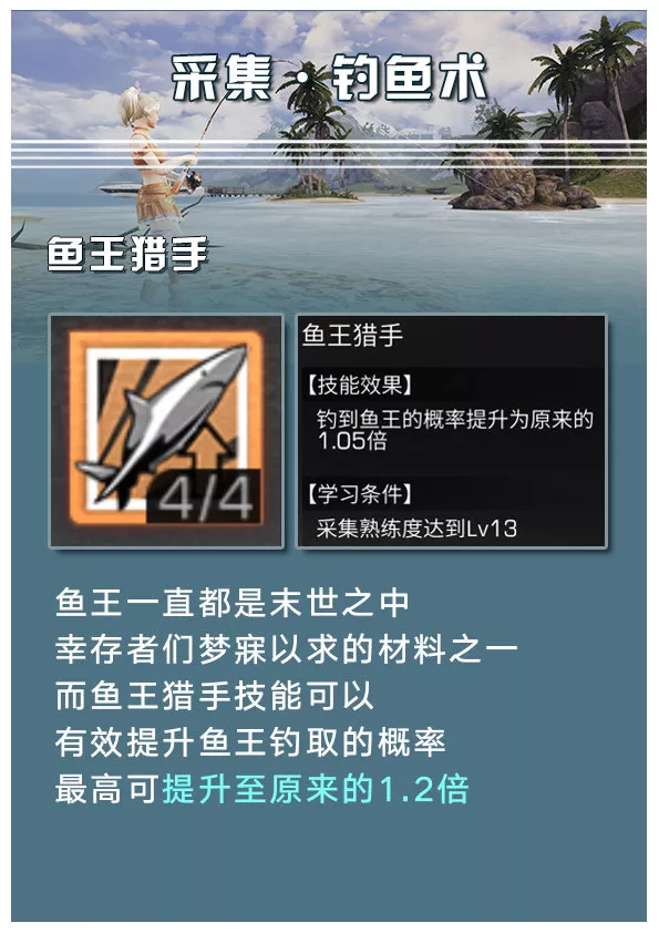 而鱼王猎手技能能够有效提高鱼王钓取的几率,最高可提高至原来的1.2倍。