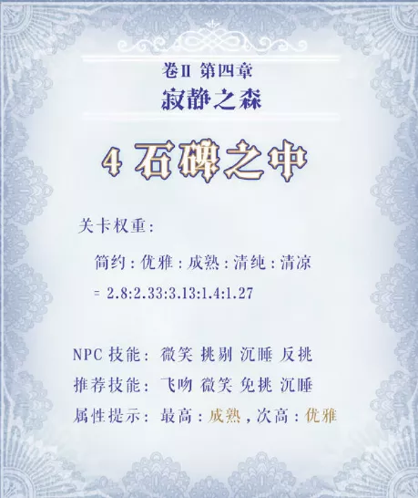 关卡权重:简约:优雅:成熟:清纯:清凉 = 2.8:2.33:3.13:1.4:1.27
