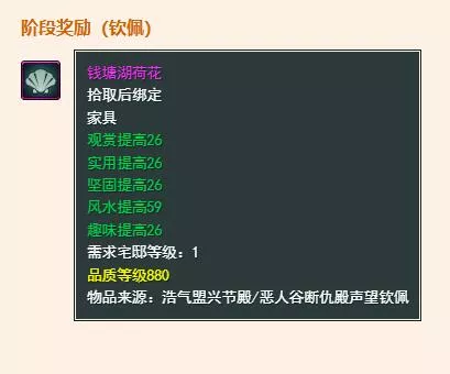3、当声望达到【钦佩】后能够获取家具【钱塘湖荷花】;